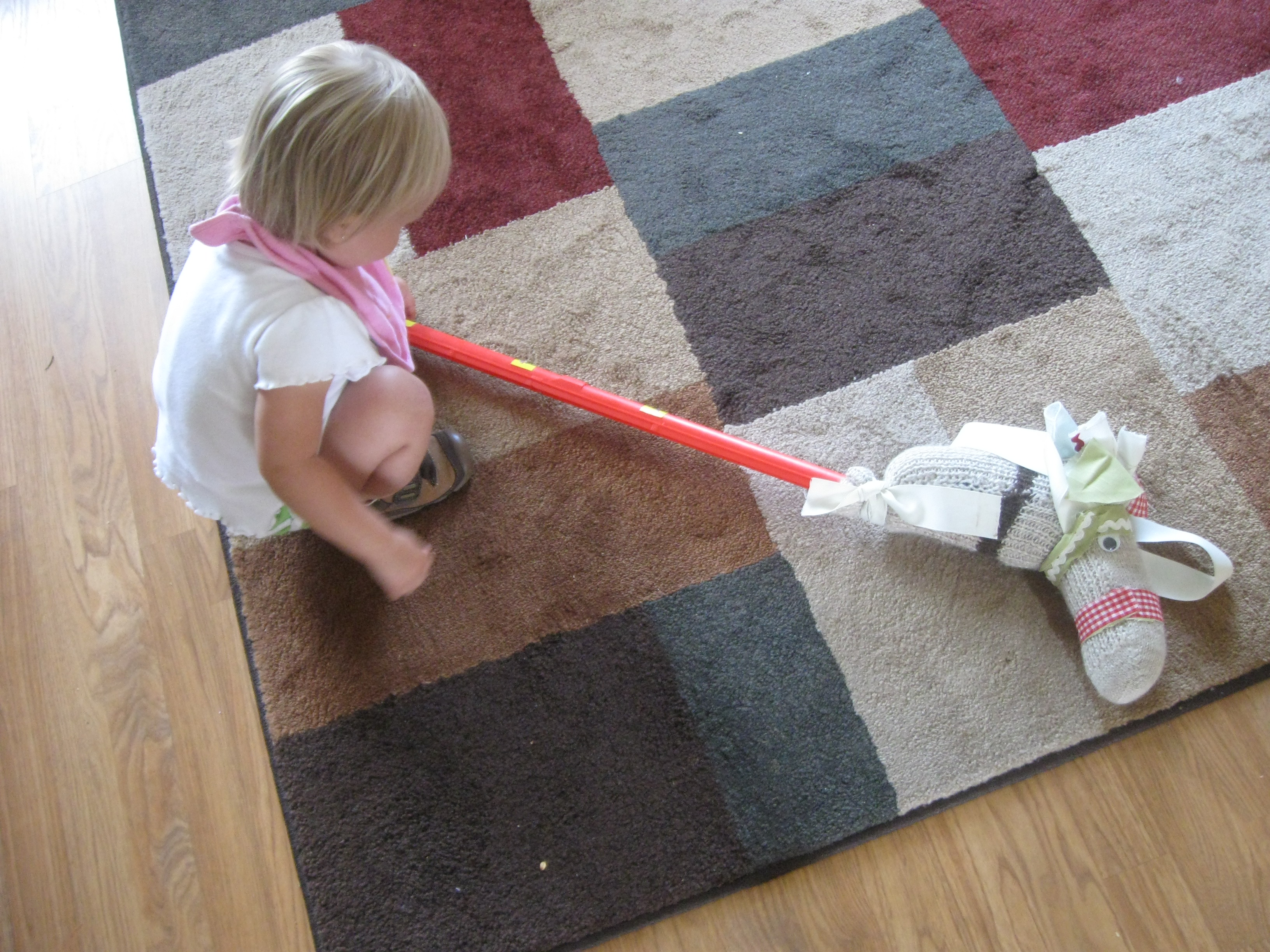 S deťmi chodíme do kníhkupectva, kde majú vlakovú dráhu. Decká sa tam dobre hrajú a ja zbieram nápady, čo nové si urobíme. Minule mi Naďa priniesla koníka na tyčke, na ktorom decká jazdia. Ako ma poznáte, nie som z tých mám, čo zaplatí za hračku, ktorú si môžeme vyrobiť doma. Takže, miesto 20 dolárov náš koník nás vyšiel zadarmo. (Všetko potrebné sme našli v garáži a mama prispela starými roztrhanými ponožkami.